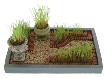 Includes tray, two decorative pots, and bricks. Painted cast resin, coco soil, gravel, and grass seed.
